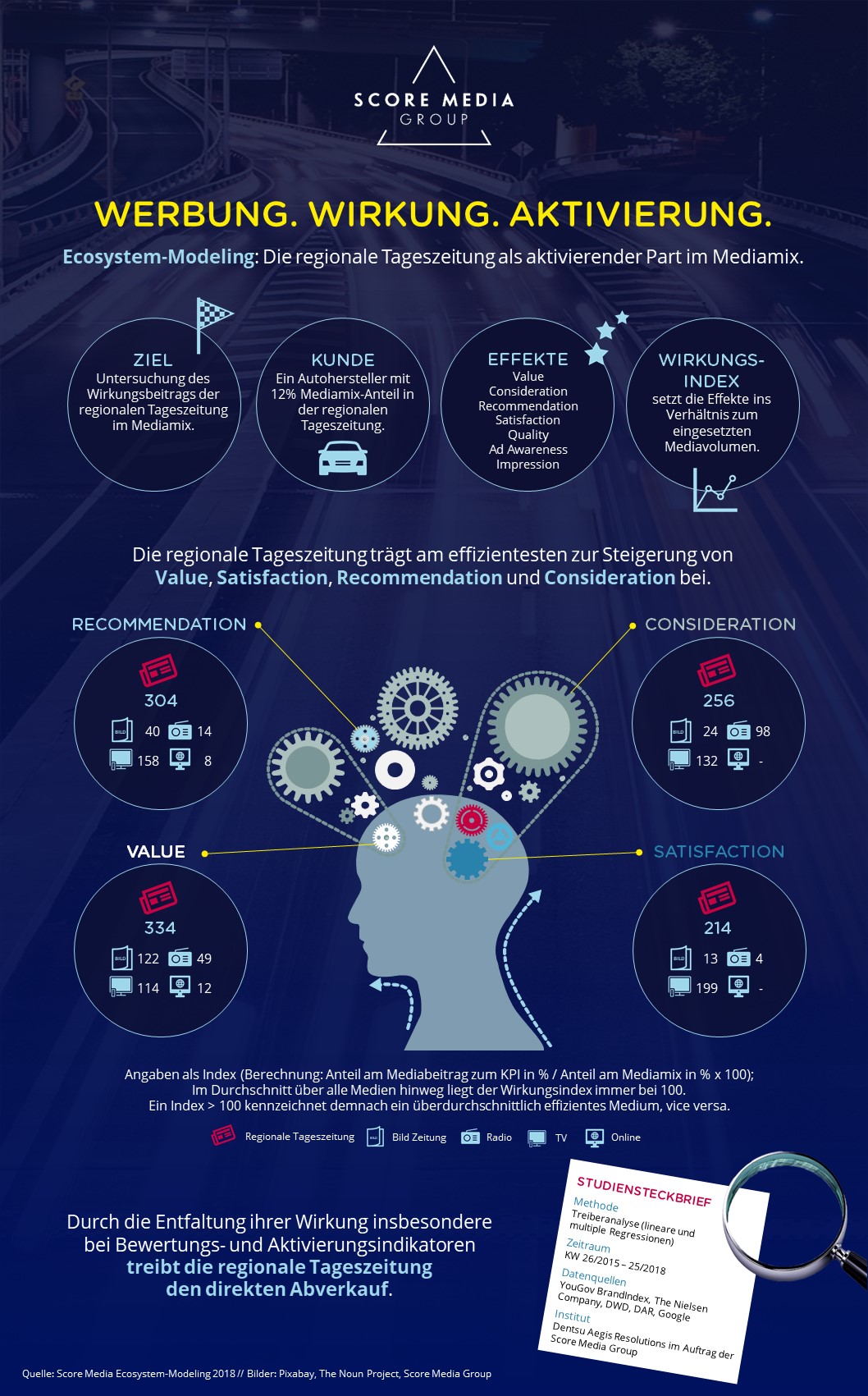 - Werbung in der regionalen Tageszeitung wirkt vor allem positiv auf die Dimensionen Value (Wahrnehmung des Preis-Leistungs-Verhältnisses einer Marke), Consideration (zukünftige Kaufbereitschaft einer Marke), Recommendation (Weiterempfehlungsabsicht) und Satisfaction (Markenzufriedenheit).