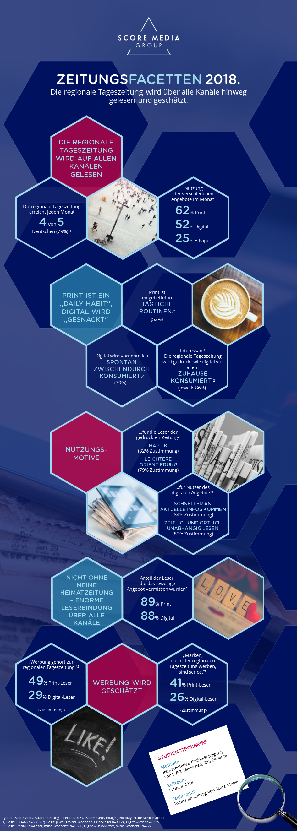 Düsseldorf/München, 9. Juli 2018. – Ob auf Papier, am Laptop, Smartphone oder im E-Paper: Jeden Monat erreicht die regionale Tageszeitung vier von fünf Deutschen (79 Prozent). Die gedruckte Ausgabe verzeichnet dabei mit 62 Prozent die höchste Nutzung, gefolgt vom digitalen Angebot (52 Prozent) – als App wie auch im Browser. Zum E-Paper greift ein Viertel der Deutschen (25 Prozent). Das ist ein Ergebnis der Gattungsstudie Zeitungsfacetten, die der Crossmedia-Vermarkter Score Media Group zum zweiten Mal aufgelegt hat. Während das digitale Angebot der regionalen Tageszeitung vor allem durch seine Aktualität (84 Prozent) und die flexiblen Nutzungsmöglichkeiten (82 Prozent) überzeugt, punktet die gedruckte Ausgabe insbesondere mit einer besseren Einordnung der Themen und einer umfassenden Informationstiefe (jeweils 62 Prozent). Werbung wird auf beiden Kanälen akzeptiert: Für 49 Prozent der Leser*innen und 29 Prozent der Digital-Leser*innen gehört Werbung zur regionalen Tageszeitung wie die Nachrichten selbst.