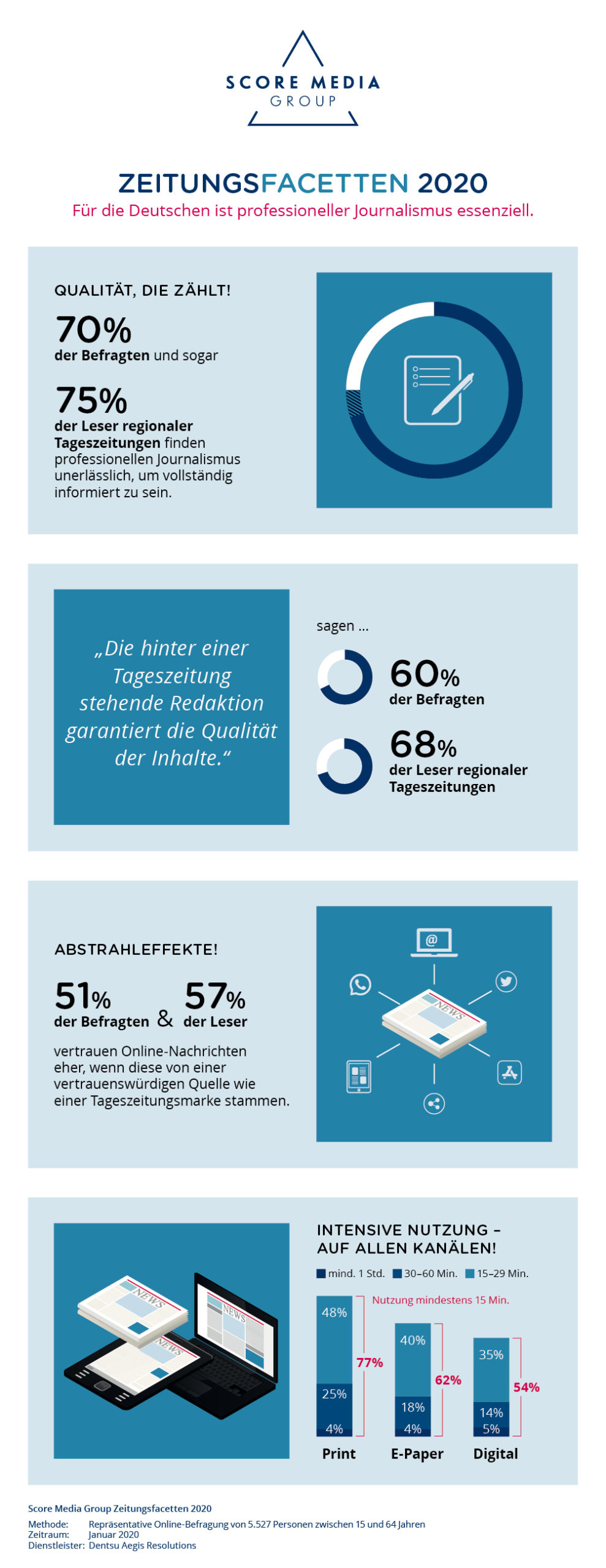 Düsseldorf/München, 09. Juli 2020 Starke Rolle! Die letzten Monate und die breite Durchdringung von Verschwörungstheorien machen einmal mehr deutlich, wie wichtig und notwendig eine fundierte Medienberichterstattung für Information und Aufklärung einer Gesellschaft ist. Die Forscher von Dentsu Aegis Resolutions haben im Auftrag des Crossmedia-Vermarkters Score Media die Deutschen Anfang des Jahres zu ihren Einstellungen und zu ihrer Meinung über die Rolle und die Bedeutung von Qualitätsjournalismus befragt.
